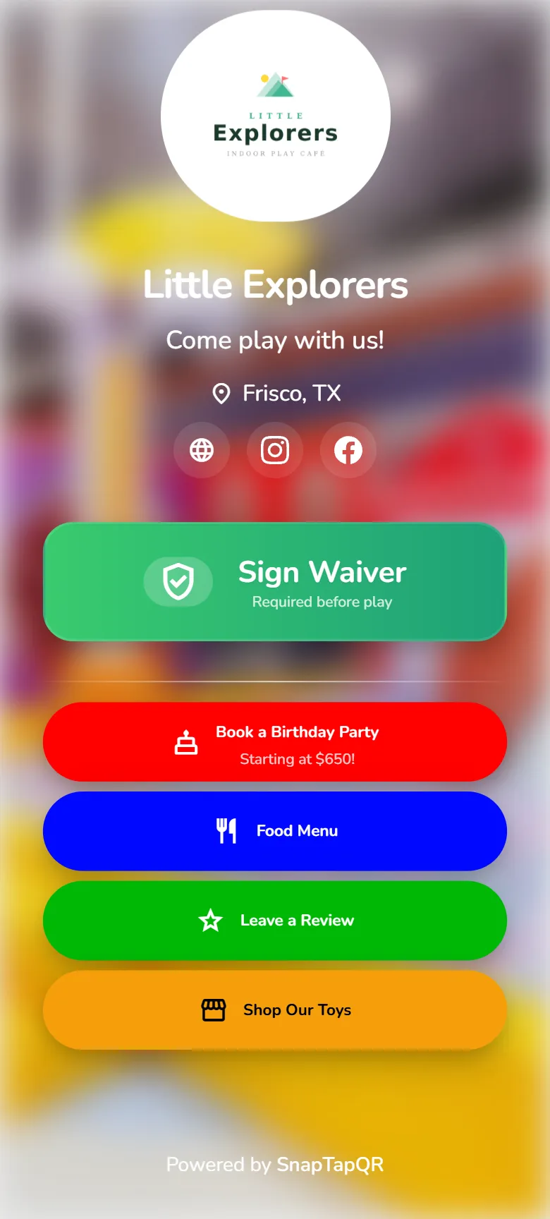 Call you, leave a Google review, book a party, request an estimate, sign a waiver — all in one tap.